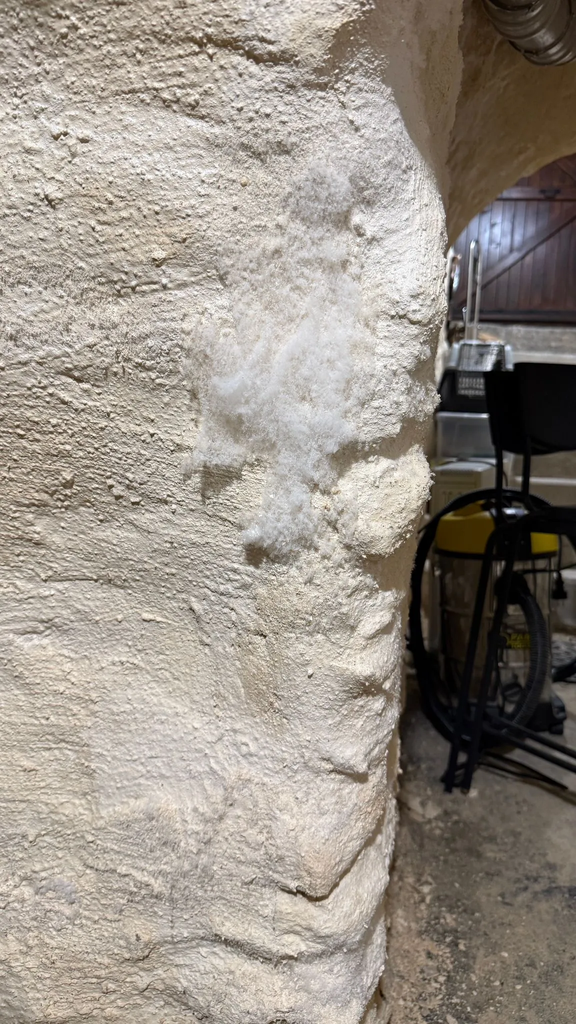 Taches sombres, papiers peints qui se décollent ou enduits qui s'effritent au bas des murs.
